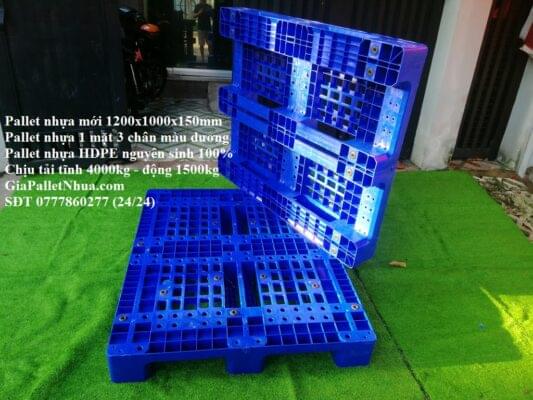 - Pallet nhựa một mặt tải nặng mới kích thước 1200x1000x150mm 3 chân màu xanh dương hiện tại có giá bán lẻ số lượng dưới 5 cái áp dụng giá đã niêm yết tại website GiaPalletNhua.com